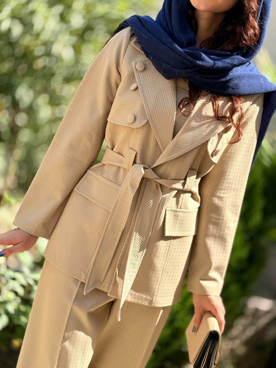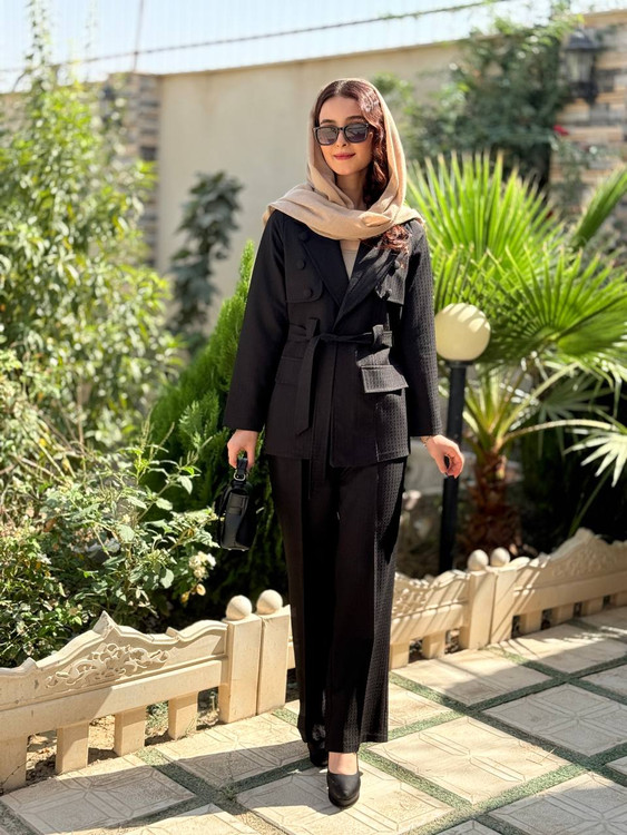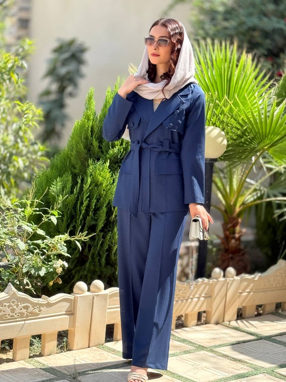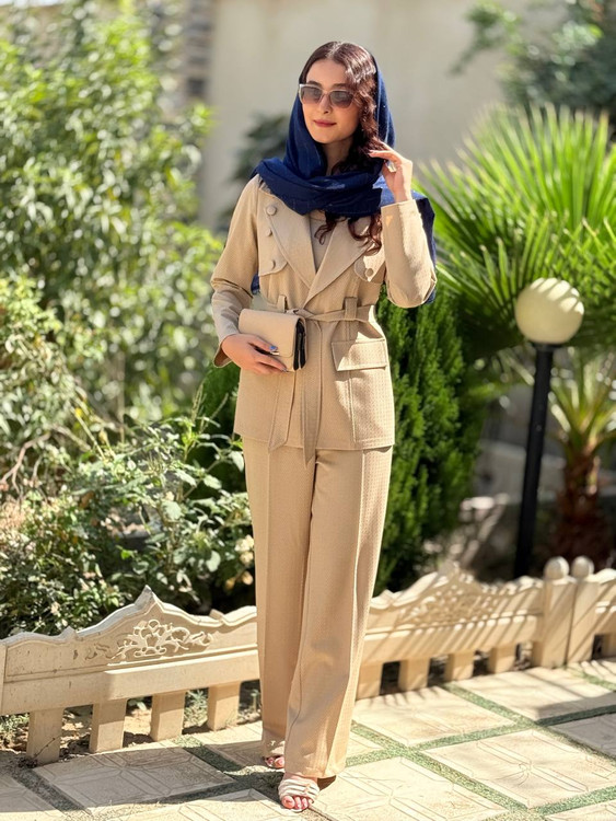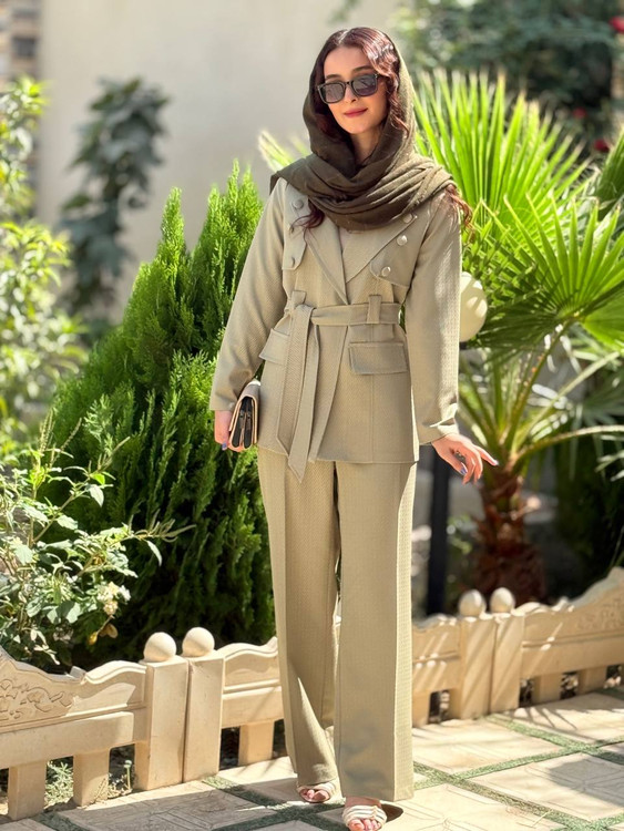 کت شلوارست جلو کاردکمه تزیینی داره با یک کمربندشلوارنیمبگ جنس مازراتی ژاکارد