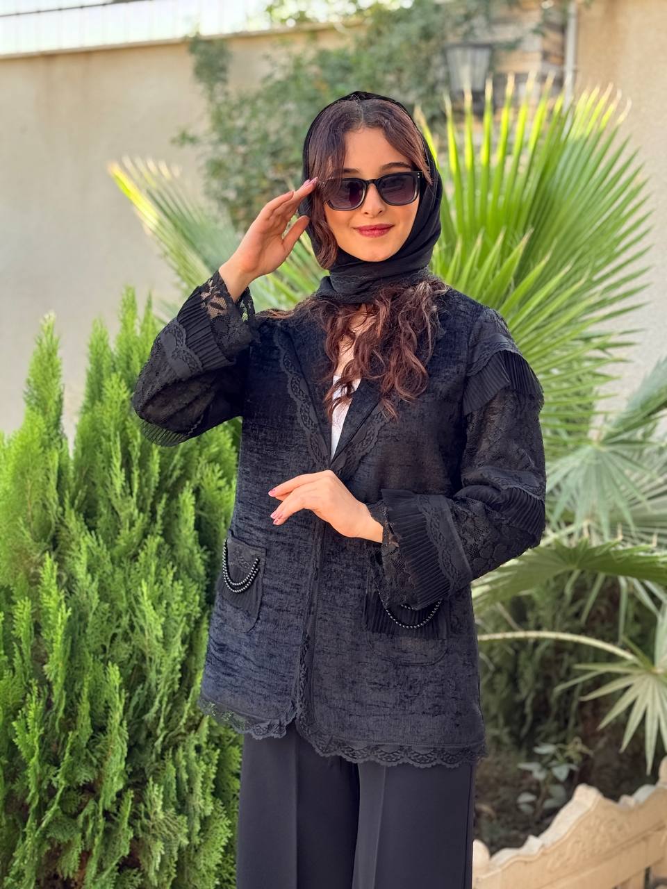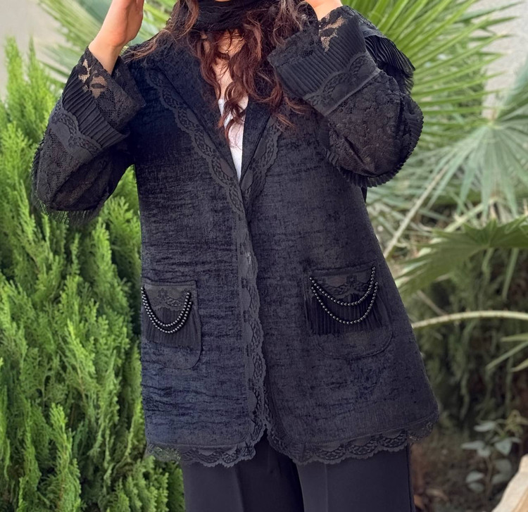 مانتو مخمل کارشده دانتل کریستال دوزی آستین یقه جیب کاملا مشکی