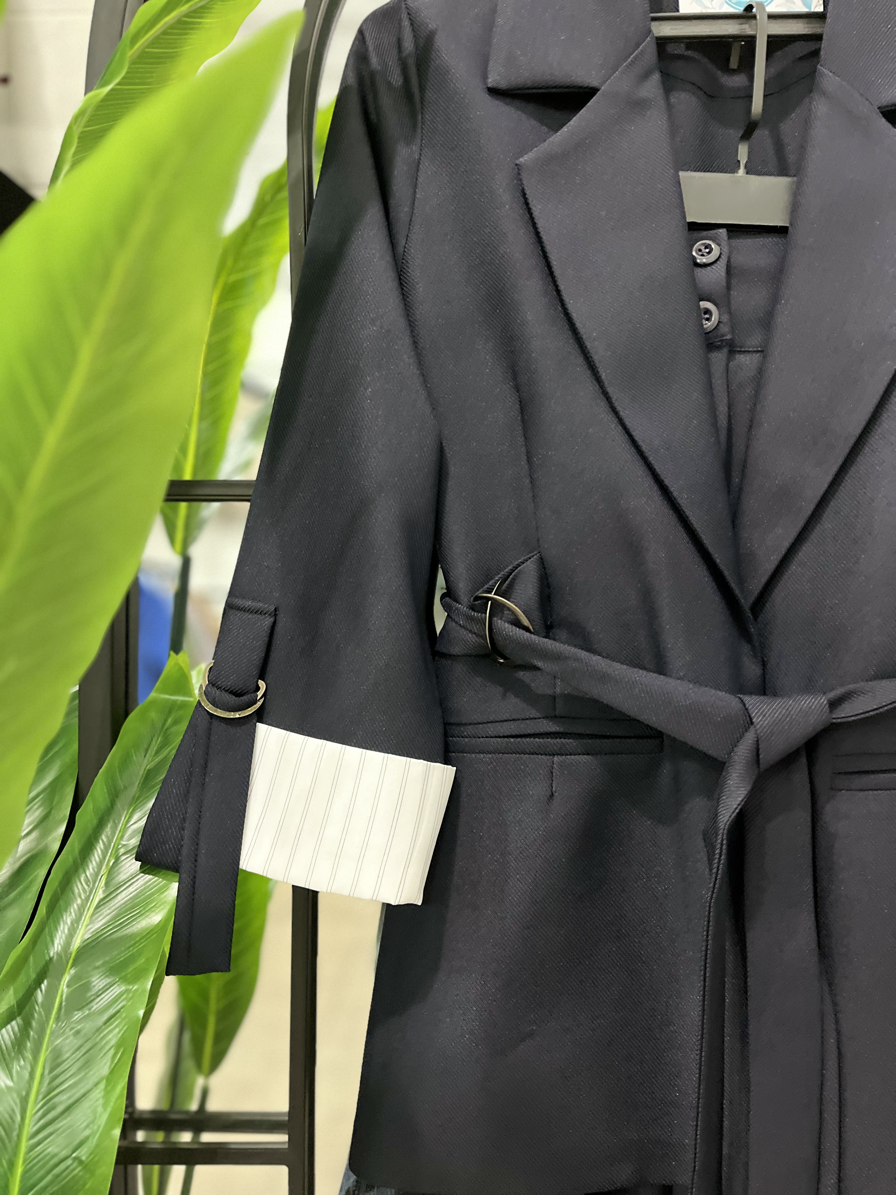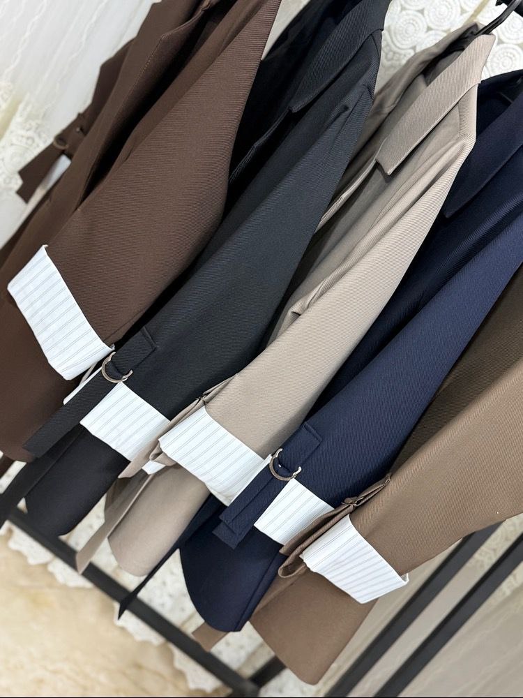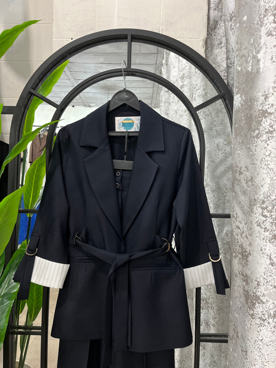کت شلوارآستین پاکتی راه راه شلوارنمیبگ کمرکش جلو زیپ دکمه جنس کجراه